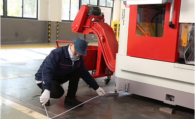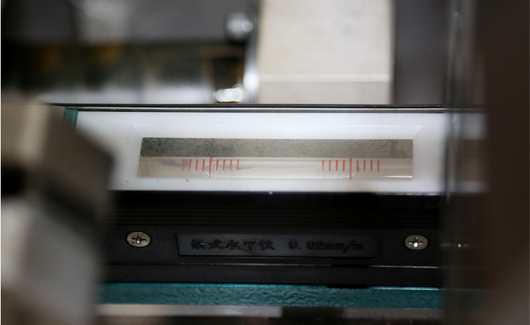 - 左右水平調(diào)整:將水平儀放置在切割線軌上,通過擰動(dòng)床身前側(cè)左右兩側(cè)底部的螺栓來調(diào)整機(jī)床床身的左右水平。調(diào)整過程中,密切觀察水平儀,直至氣泡位于水平儀的正中央,此時(shí)達(dá)到左右水平狀態(tài),隨即擰緊螺栓固定。